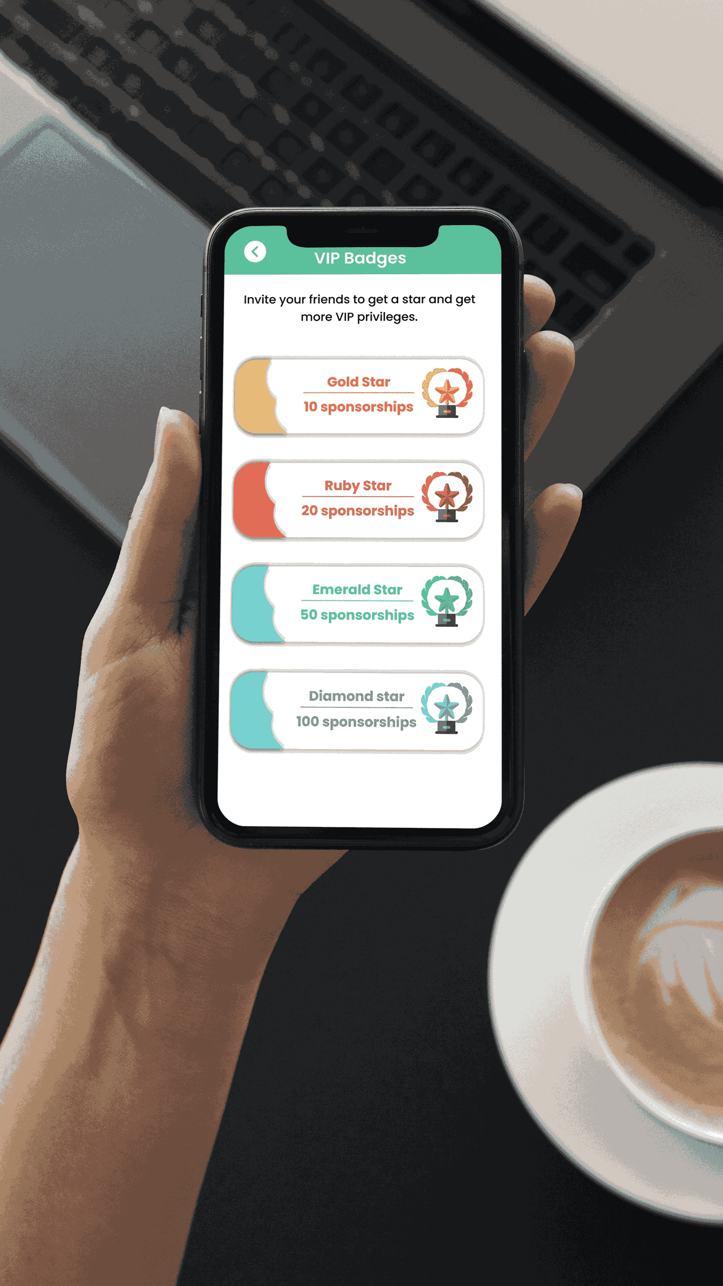 Notre système de classement : invite des amis, crée des activités ou participe et tu gagneras des médailles. De cette façon, nous sommes toujours sûrs d’avoir uniquement des comptes réels sur notre application. Tu peux acheter des étoiles VIP pour débloquer toutes les fonctionnalités comme une option de rencontre, mais tu peux également gagner des étoiles VIP gratuites avec notre option de parrainage. Donc l’application sera aussi un pour gagner des points.
